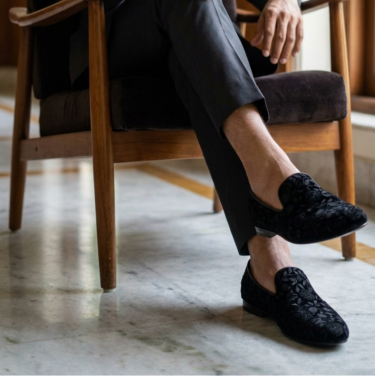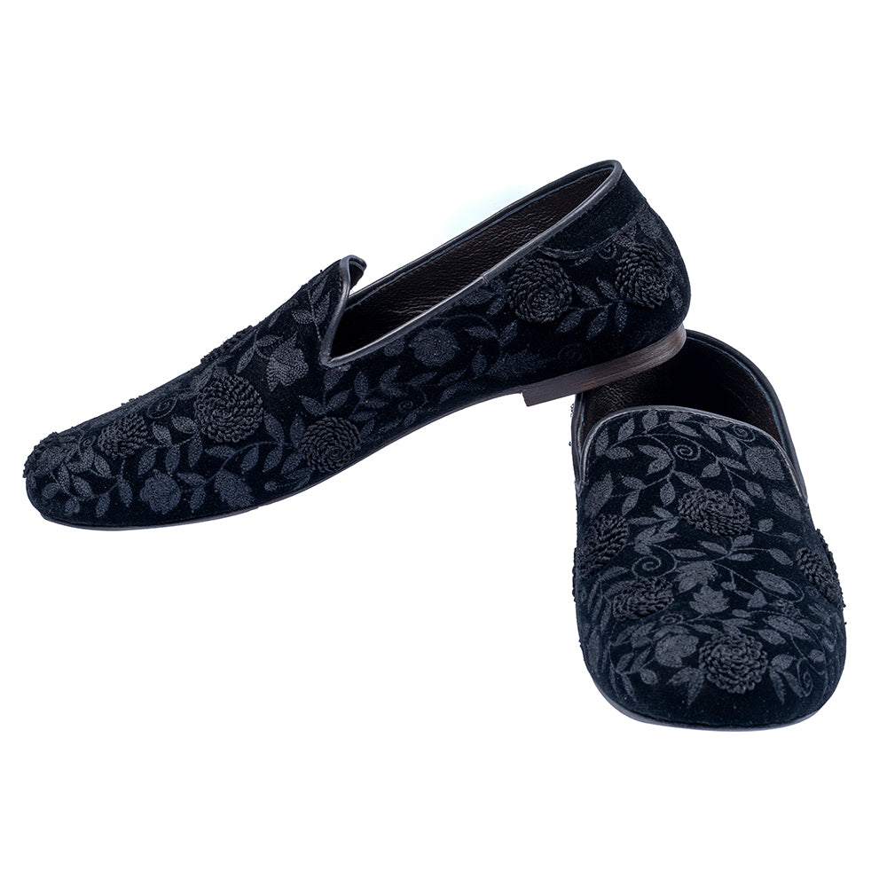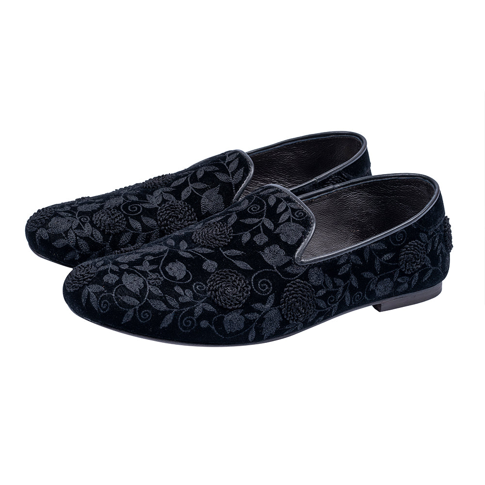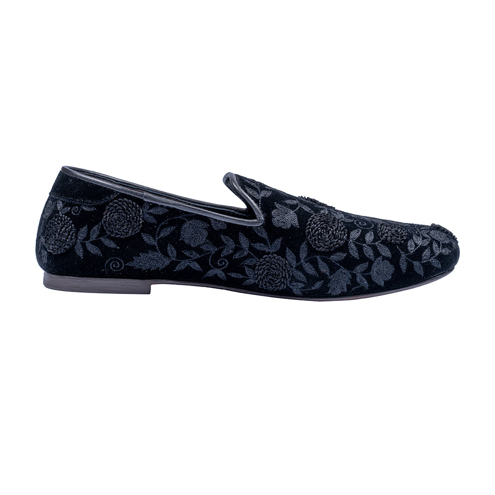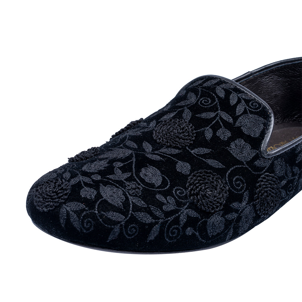 A refined ode to understated luxury, the Noir Garden loafer features intricate tone-on-tone velvet embroidery inspired by evening florals. Each motif is sculpted in raised threadwork that gives subtle dimension without overpowering the silhouette. Effortlessly sophisticated, quietly detailed, and perfect for evening celebrations, formal gatherings and every refined festive look