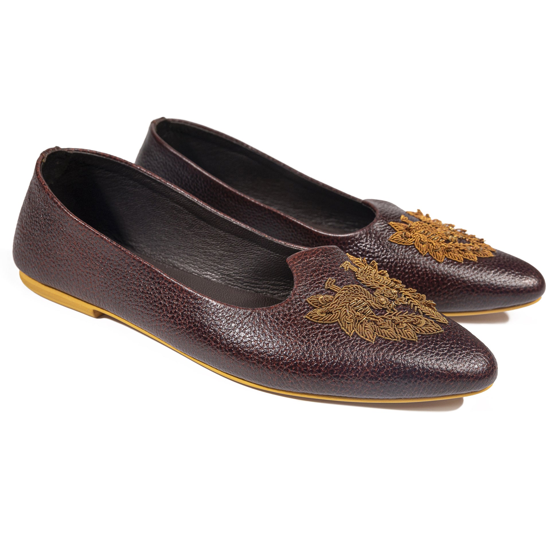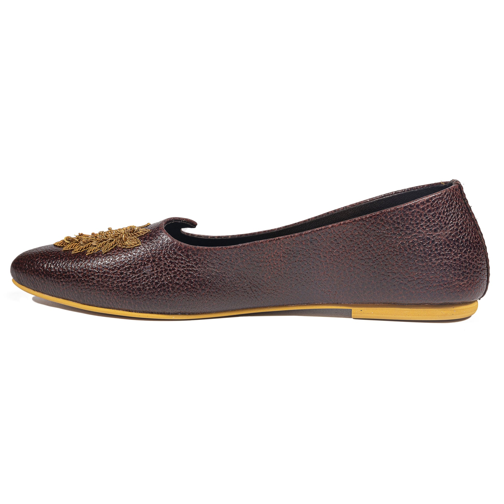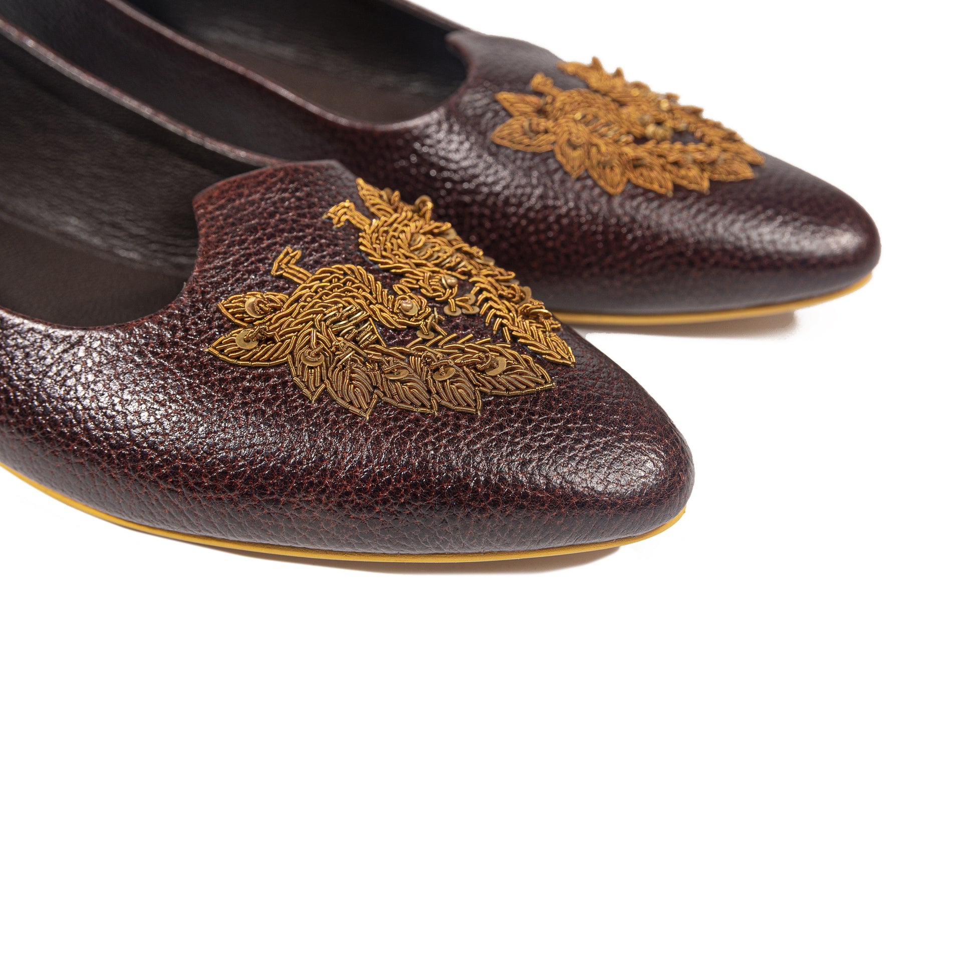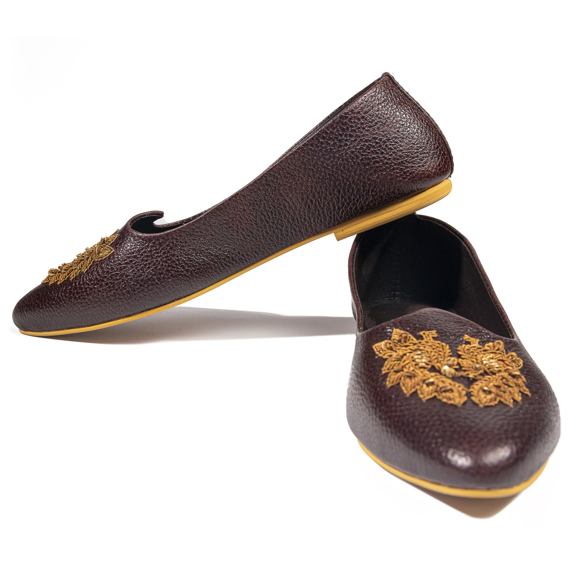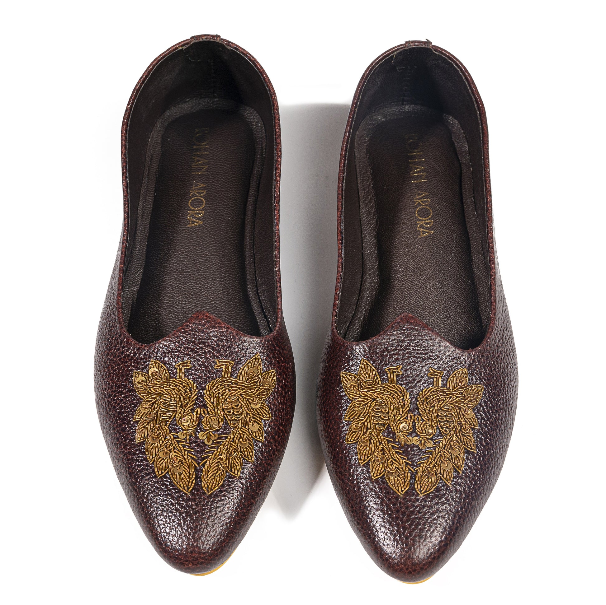 Crafted in rich textured leather and adorned with an antique-gold crest, The Chocolate Crest is an ode to understated Indian luxury. The clean silhouette balances old-world embroidery with modern refinement—making it a versatile choice for both festive wear and elegant everyday ensembles. Sophisticated, subtle and timeless, this pair brings quiet grandeur into contemporary dressing—an iconic essential.