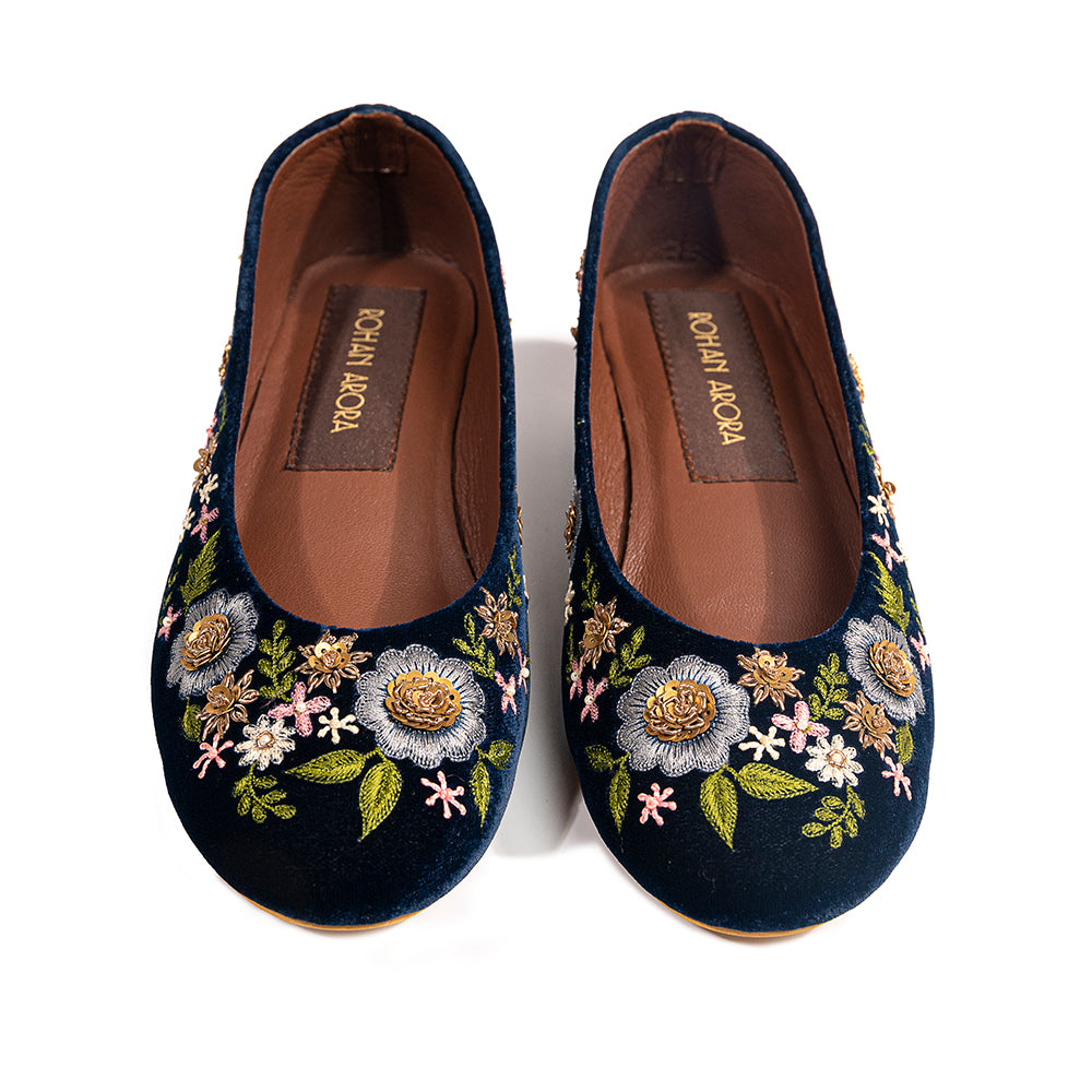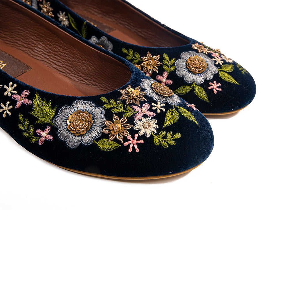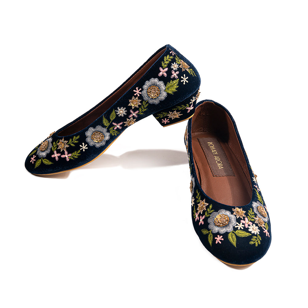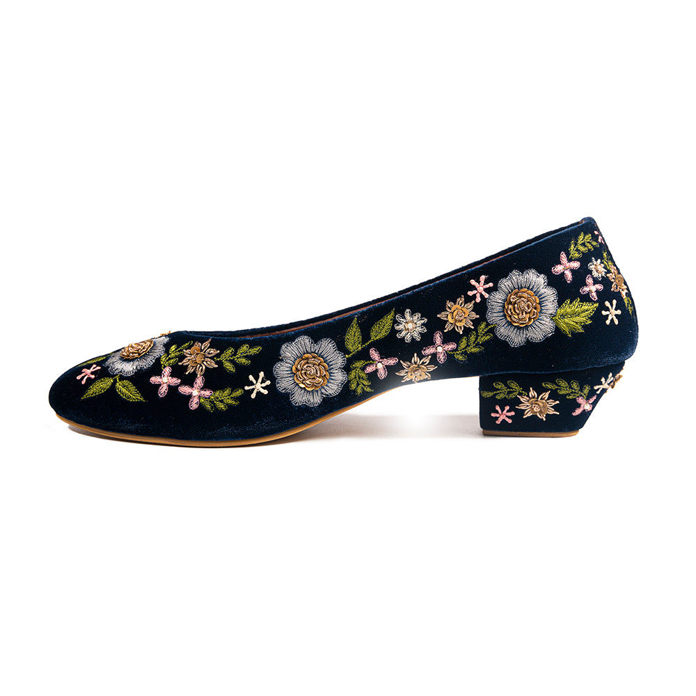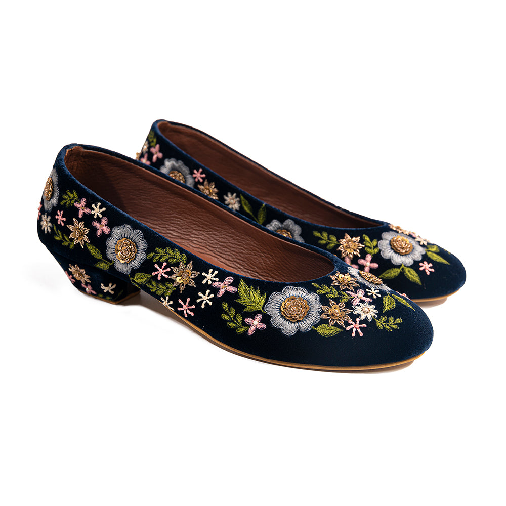 Crafted in midnight velvet and delicately embroidered with soft pastel florals, The Evening Garden captures the romance of twilight celebrations. Hand–finished metallic centres and leaf motifs add a gentle shimmer, while the sculpted heel makes it effortless for long festive evenings. Graceful, feminine and quietly opulent—this pair brings heirloom couture into a modern silhouette, perfect for weddings, cocktails and elegant soirées.