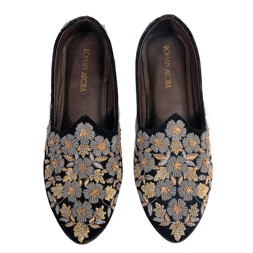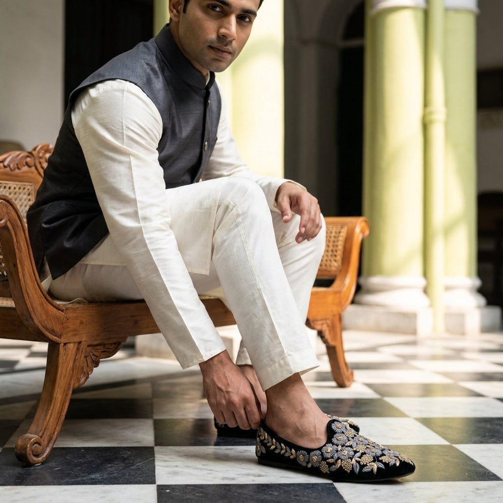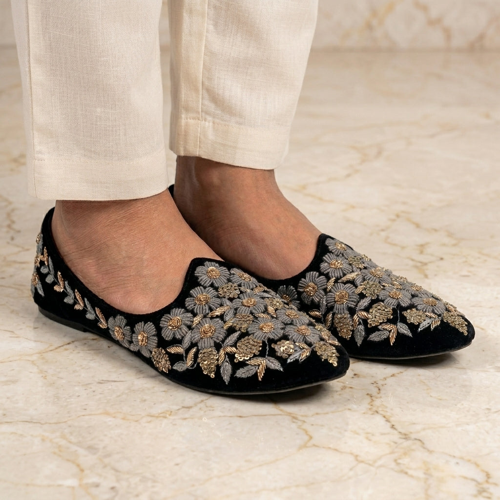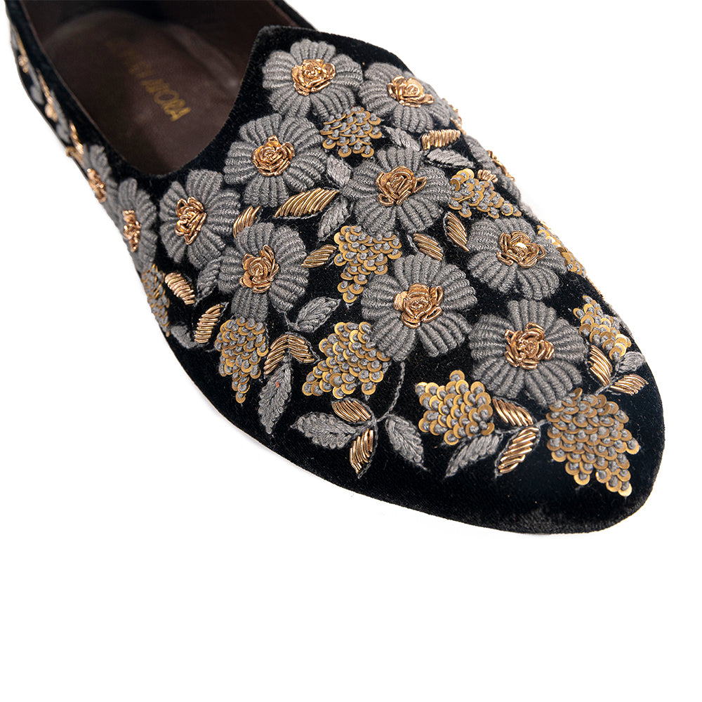 A poetic fusion of grey florals and gold accents, The MIDNIGHT BLOOM transforms classic velvet into a canvas of lush embroidery. Each petal and leaf is meticulously hand-crafted, creating a 3-D botanical texture that feels regal yet quietly refined. Elegant, statement-making and undeniably artistic—perfect for evening functions, festive celebrations and sophisticated Indian weddings.
