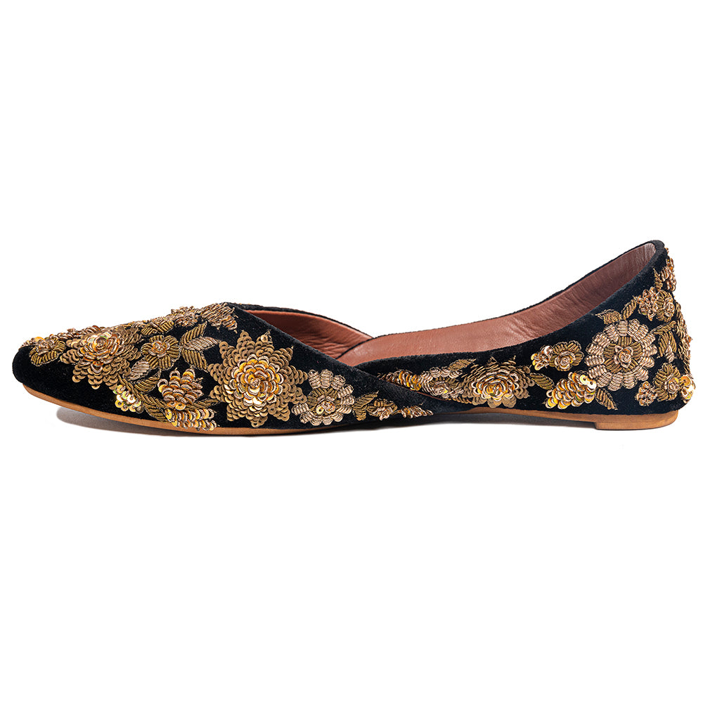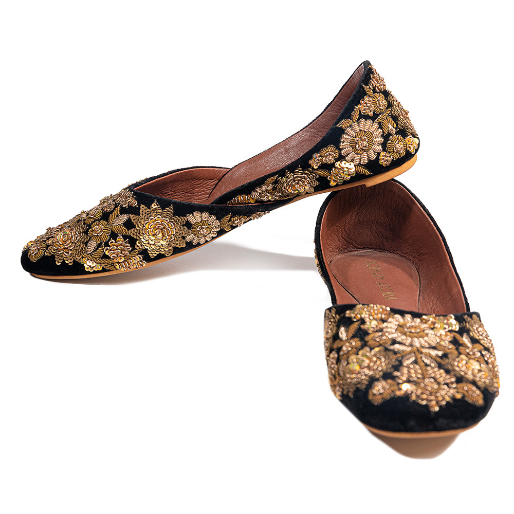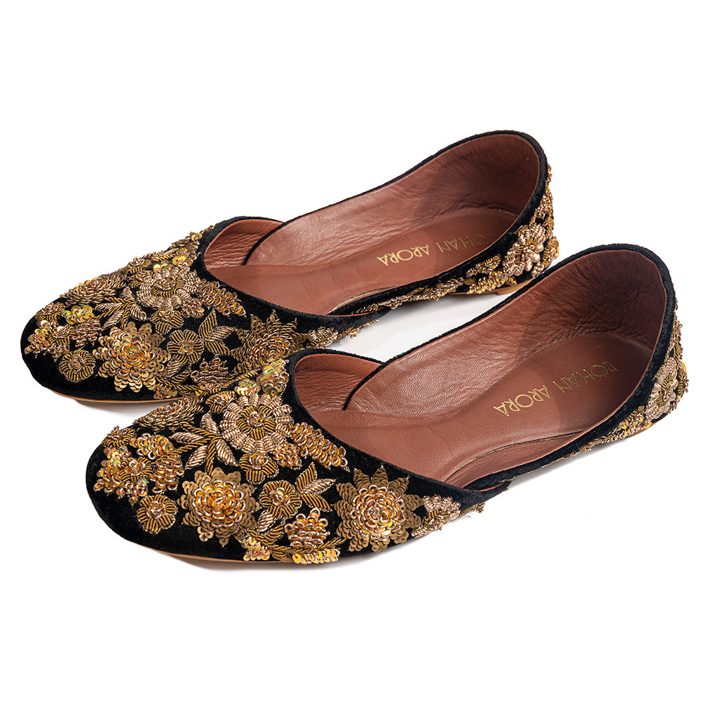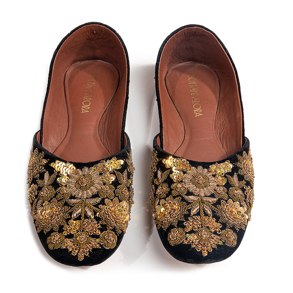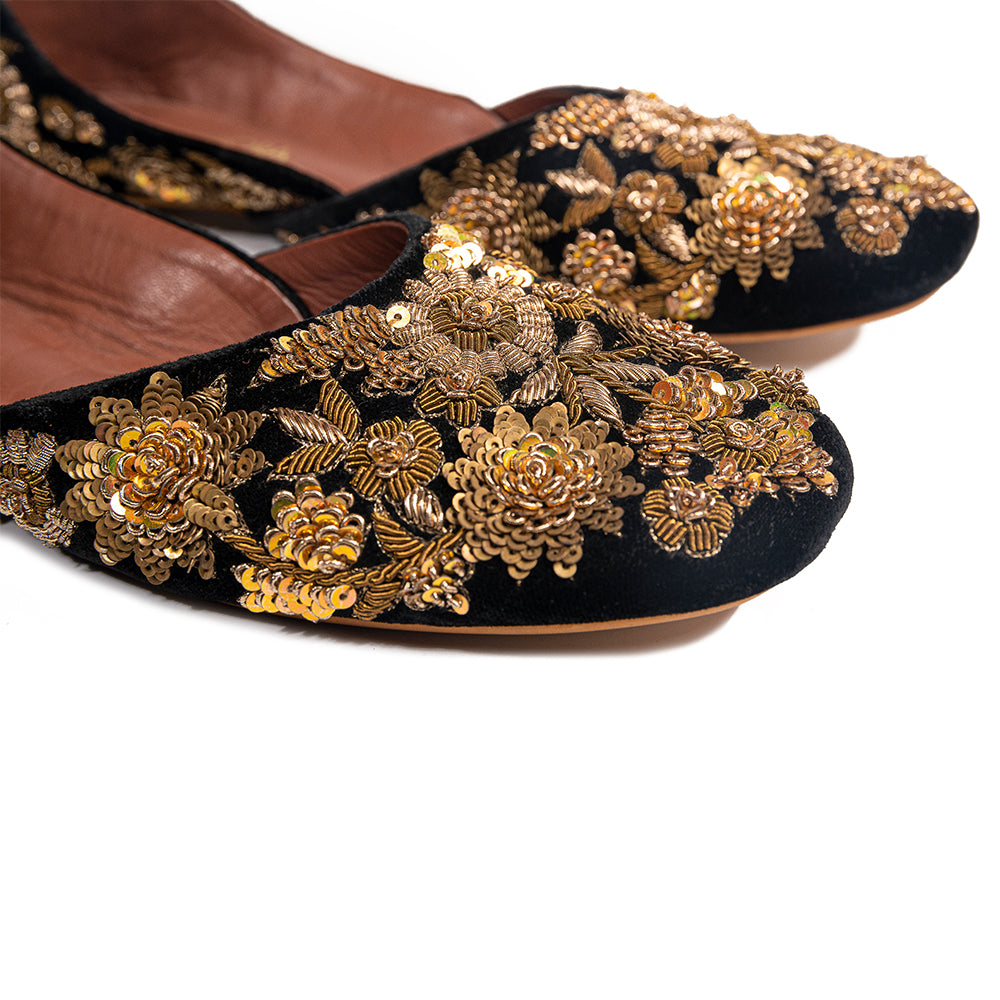 Draped in black velvet and embroidered with hand-cut metallic florets, The Midnight Heirloom draws inspiration from vintage zardozi ateliers of North India. Each golden bloom sits like jewellery against black, evoking the grandeur of royal festive couture and the intimacy of heirloom craftsmanship passed from one generation to the next. A dramatic yet timeless statement for evening celebrations, weddings and ceremonial ensembles—luxury in its most iconic form.