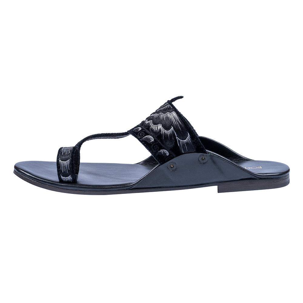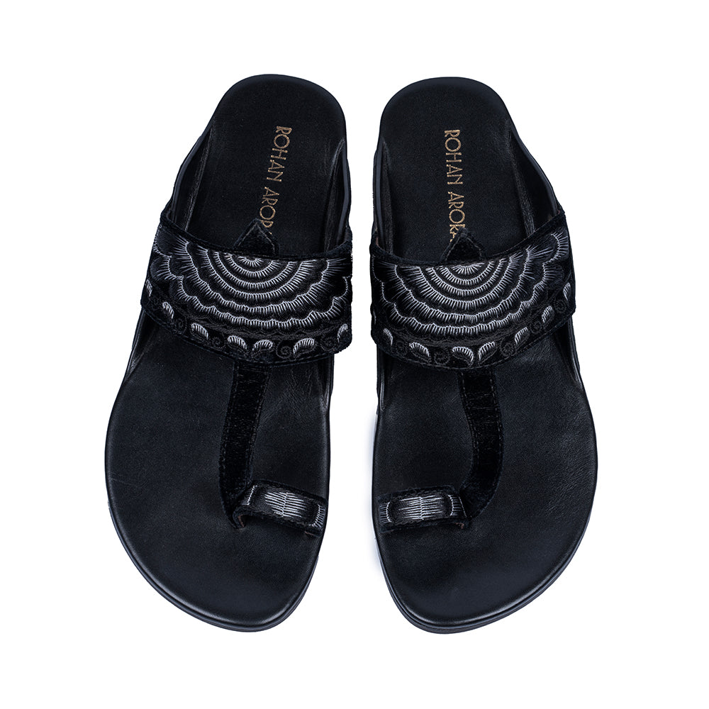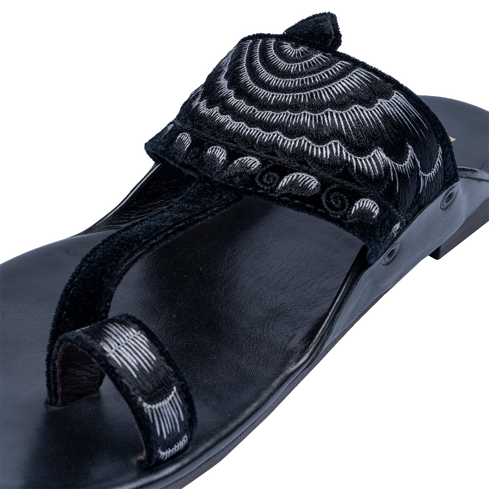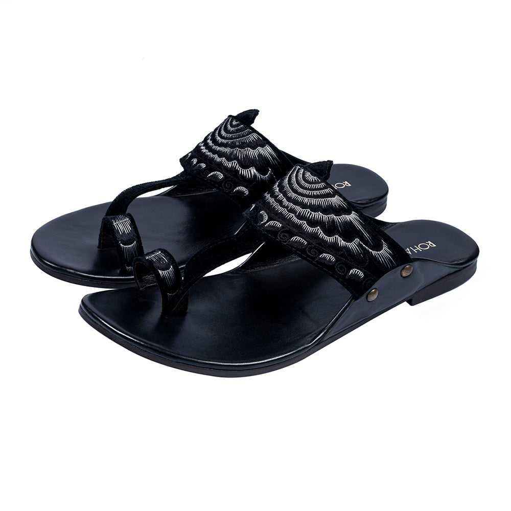 Crafted in deep black leather and elevated with a textured kolhapuri silhouette, Regal Noir blends traditional craftsmanship with modern minimalism. The hand-embroidered threadwork adds depth without overpowering, keeping the look sophisticated and sleek.