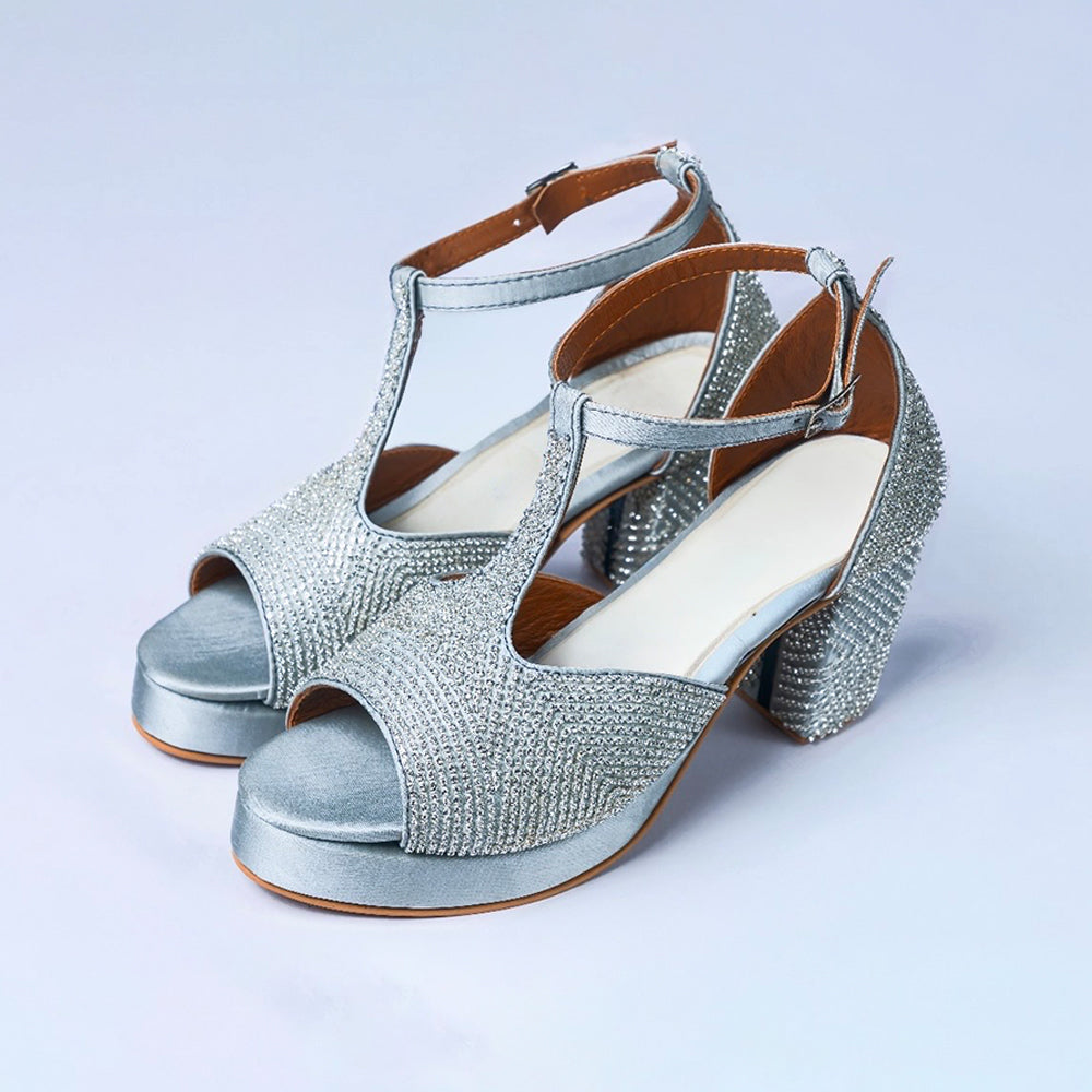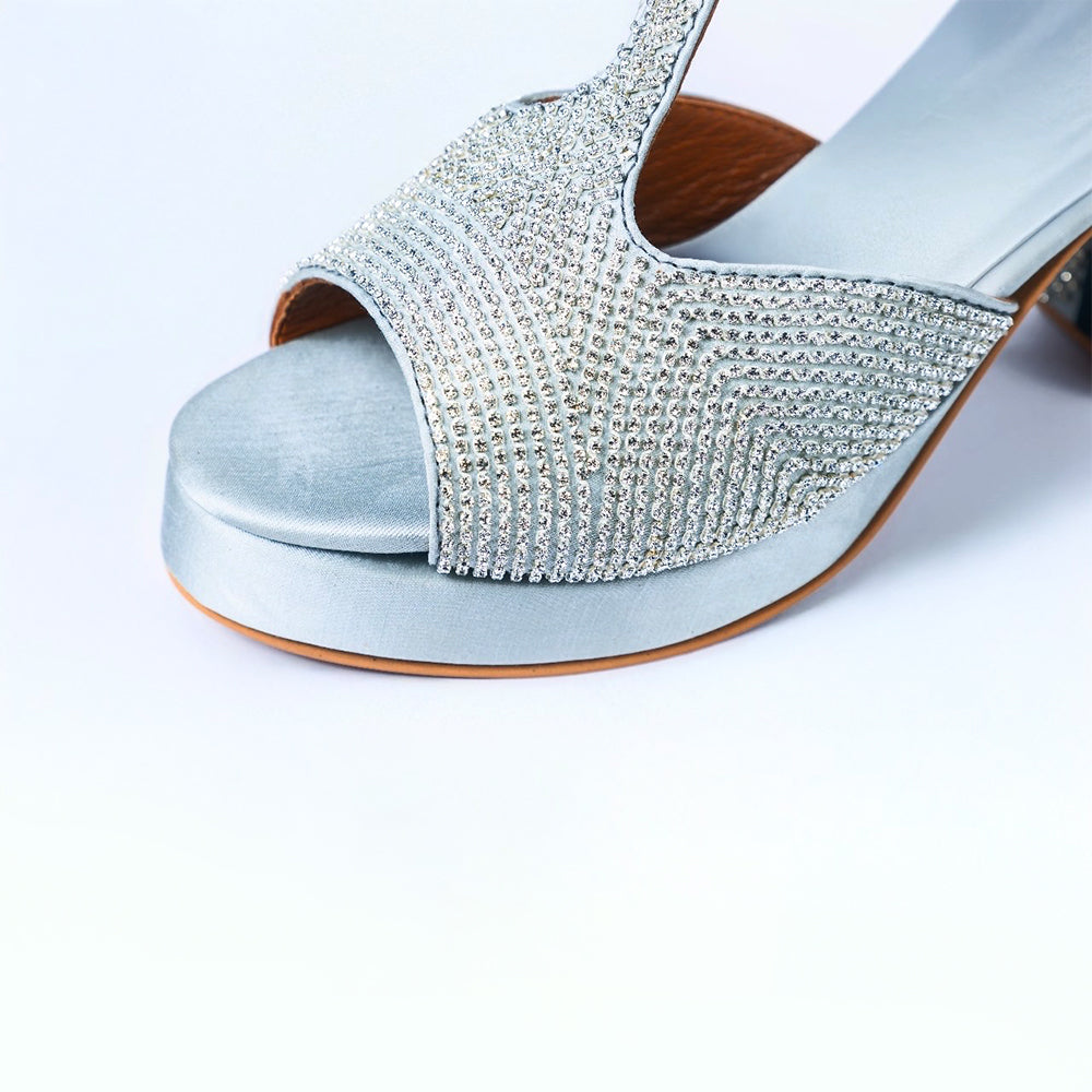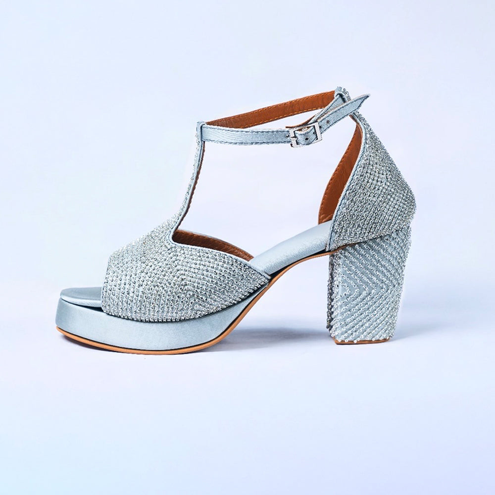 Bathed in luminous silver satin and embellished with hand–placed crystals, The Silver Aurora captures the radiance of night celebrations. The sculpted block heel sparkles with mirrored detailing, while the platform silhouette offers height with effortless comfort.